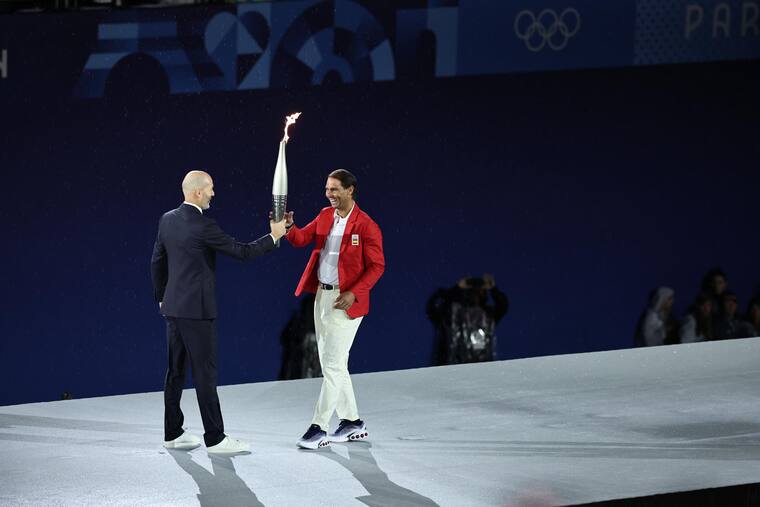 El encapuchado con la llama llegó justo después, para entregársela al futbolista Zinedine Zidane, quien a su vez se la entregó al tenista español Rafael Nadal —desatando un pequeño momento de locura en el Trocadero— para llevarla de vuelta hacia el museo del Louvre junto a otras tres leyendas del deporte: Serena Williams, Nadia Comaneci y Carl Lewis.
