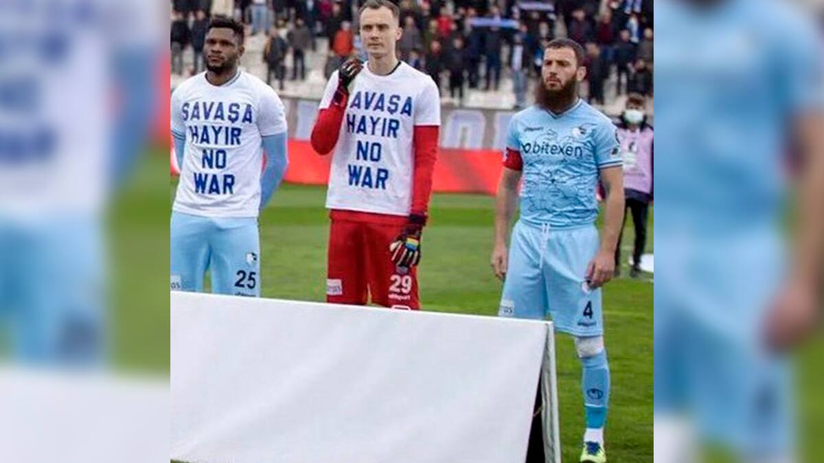 En el marco de un juego entre Erzurumspor y el Ankaragucu, de la segunda categoría del fútbol turco, todos los jugadores salieron a la cancha con una camiseta en la que se leía el mensaje: ‘No a la guerra’, en apoyo a las sanciones que se han emprendido sobre el territorio ruso.