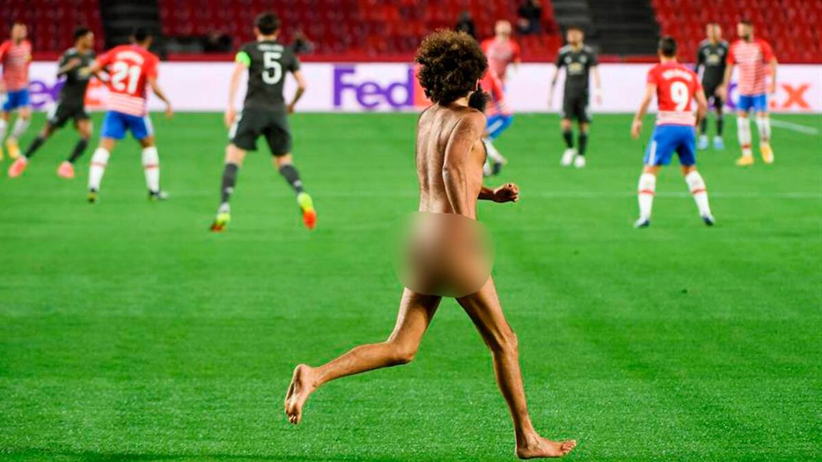 Un hombre totalmente desnudo ha saltado al césped del Nuevo Los Cármenes en los primeros minutos del partido de la Liga Europa que disputan el Granada y el Manchester United, lo que ha obligado a que se pare el encuentro durante casi un minuto.