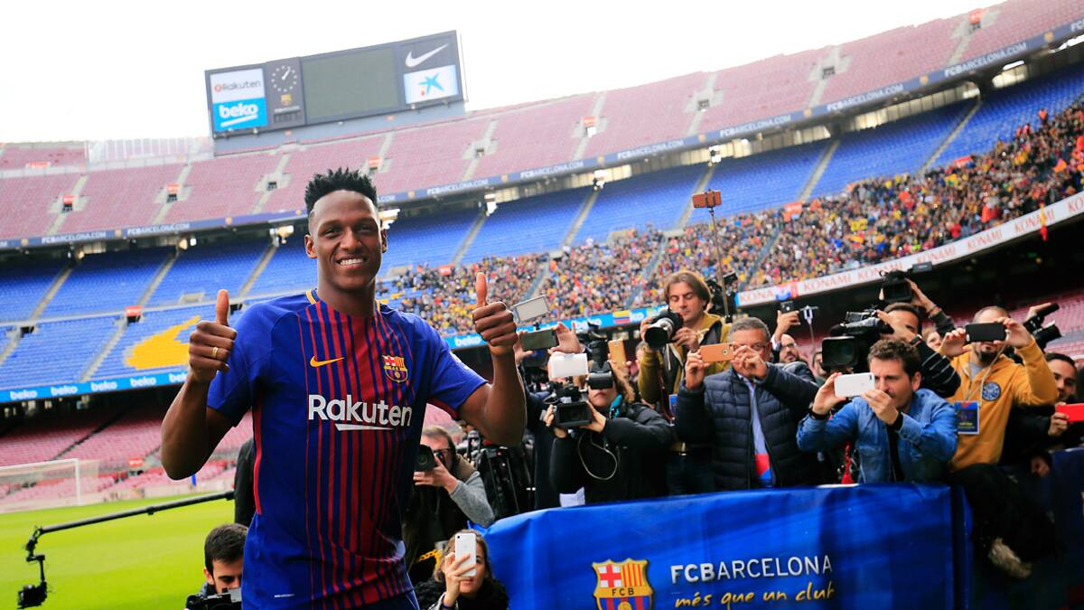 Más de 8.000 aficionados que asistieron este sábado al estadio del Barcelona le dieron la bienvenida al defensa central colombiano.