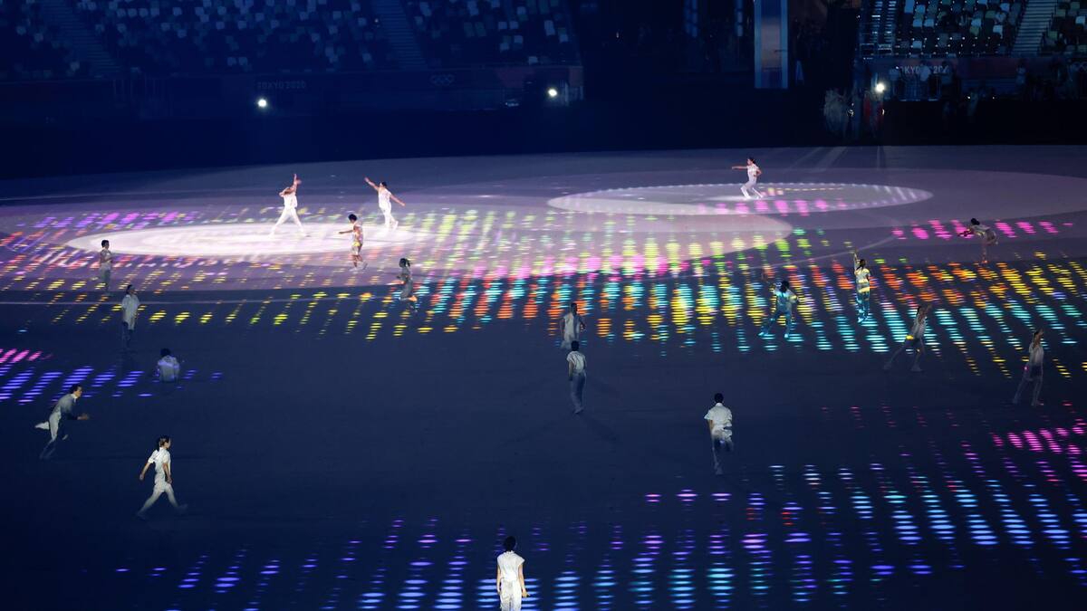 El bailarín de claqué Kazunori Kumagai se sumó a ellos mientras entraban farolillos flotantes y unos anillos olímpicos labrados nuevamente en madera, en esta ocasión tomada de los árboles nacidos de semillas traídas a Japón por atletas que participaron en los primeros Juegos Olímpicos que albergó Tokio, en 1964.