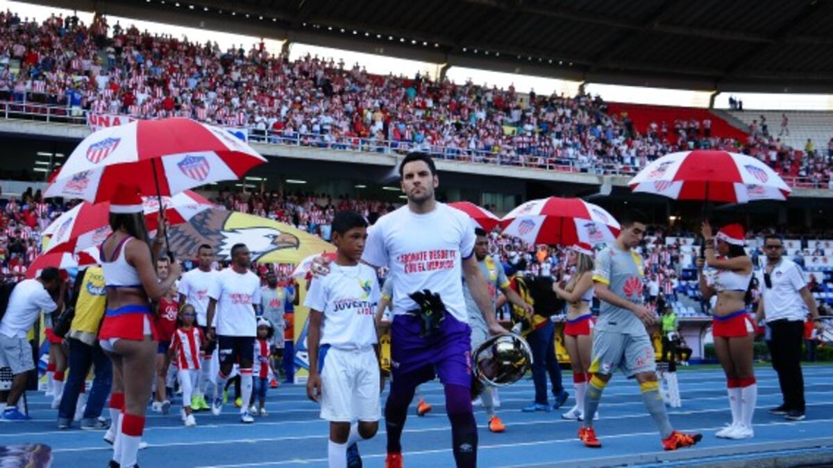 Los jugadores del Junior saltaron a la cancha con una camiseta blanca, alusiva a la campaña de abonos del equipo rojiblanco para la próxima temporada que es impulsada y liderada por EL HERALDO.