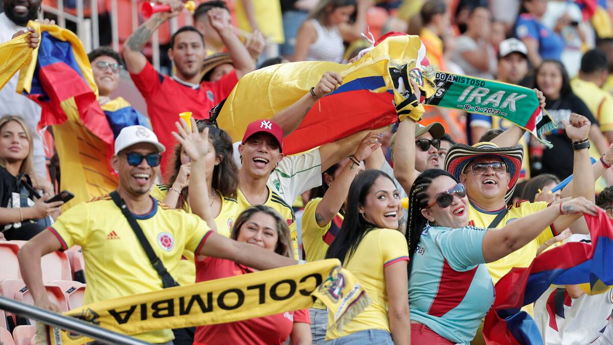 La hinchada colombiana, que llegó desde muchos puntos de España, alentó con un animado estruendo a la selección de su país con banderas, bufandas y mucho sonido de bubucelas desde más de tres horas antes del inicio del partido.