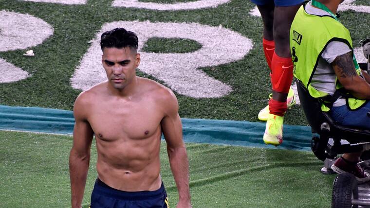 90+8. Claro agarrón en el área contra Falcao y los jugadores de Colombia, enérgicos, reclaman penalti. El árbitro ignora y no recibe corrección del VAR.