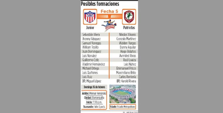 Por nómina Junior es más que su rival de esta tarde, Patriotas, pero de esto no se gana en el fútbol. Esa jerarquía los rojiblancos tienen que demostrarla desde el pitazo inicial, por eso cuando la pelota ruede a las 5:30 de la tarde en el estadio Metropolitano Roberto Meléndez, deben estar concentrados, jugar con inteligencia y convencer a la hinchada que son un equipo que puede divertirse con la pelota.