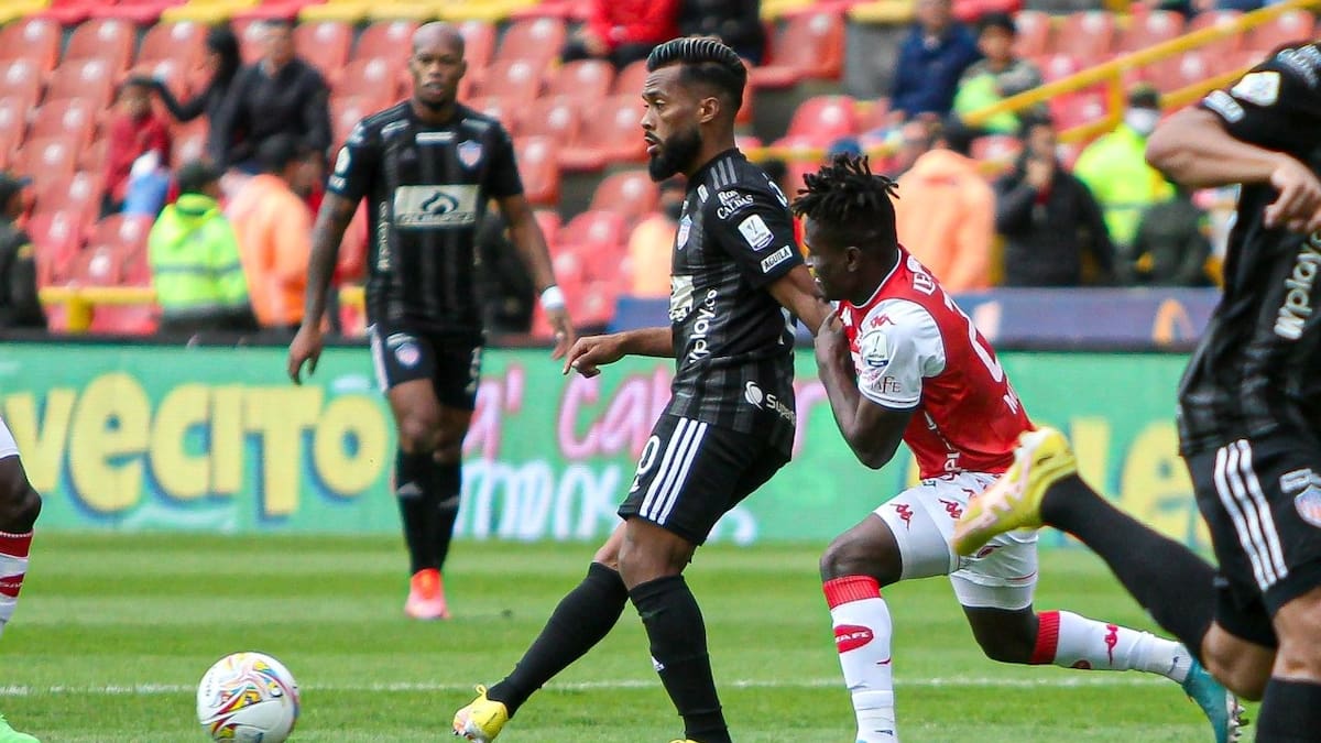 57. José Enamorado cae en el área ante una falta de Jorge Arias. El VAR alerta al árbitro Jhon Ospina, pero después de una larga revisión, en la que también se analizó un posible fuera de lugar del jugador de Santa Fe, el juez central consideró que no existió la infracción.