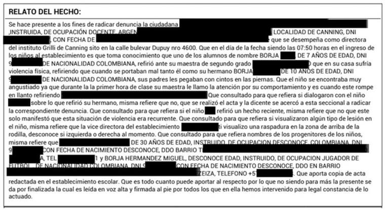 Valeria Goluza, directora del Instituto Grilli de Canning, al que pertenecen los dos pequeños, acudió a la Comisaría de la Mujer y la Familia de La Unión (Ezeiza) para denunciar un supuesto caso de violencia familiar basado en el testimonio de la profesora del menor de los chicos.