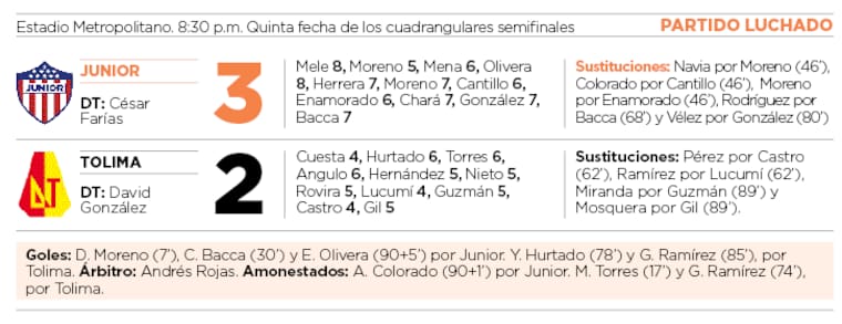 Tolima estaba quemando tiempo y apelando a algunas marrullerías, que tal vez le hicieron falta en un momento a Junior cuando ganaba 2-0, y estaba sacando un empate de oro que eliminaba al ‘Tiburón’ y dejaba el asunto de la clasificación entre los ‘Pijaos’ y Once Caldas en la última fecha.