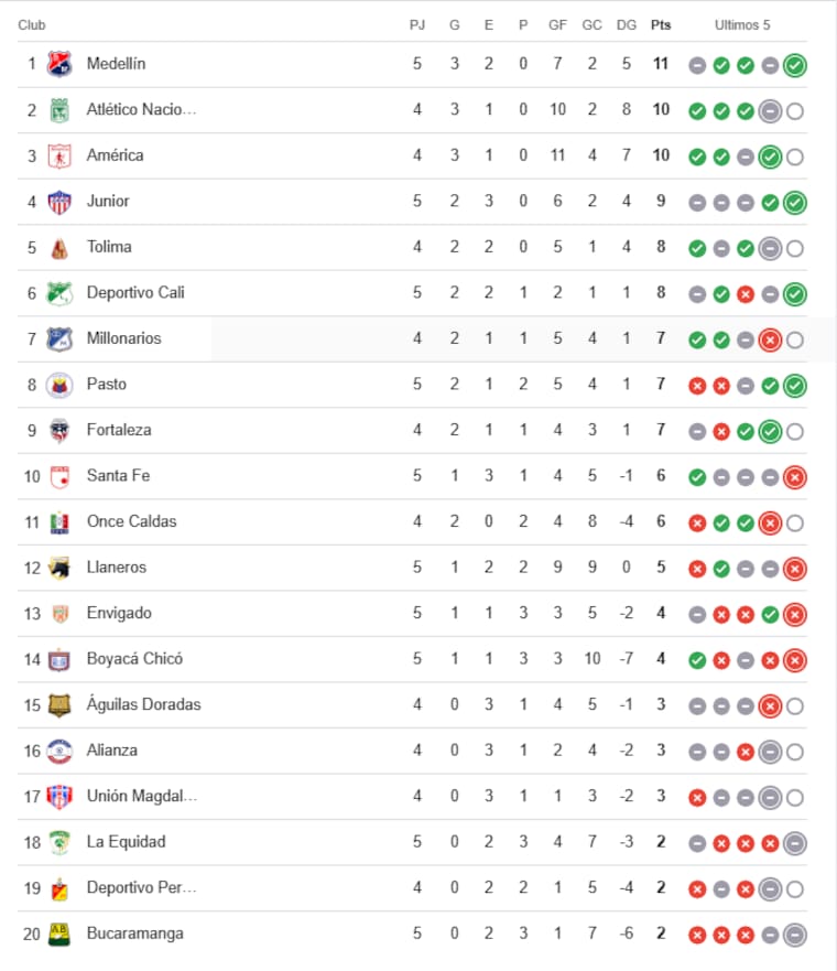 Atlético Bucaramanga, que empató 0-0 en su casa ante Alianza Valledupar, sigue sumido en el último lugar con solo dos punticos. Deportivo Pereira y La Equidad poseen las mismas unidades, pero la peor diferencia de gol es de los ‘Búcaros’.