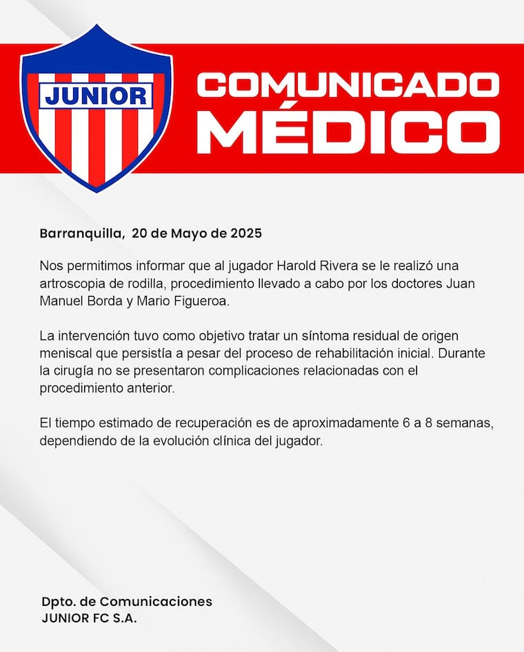 “Nos permitimos informar que al jugador Harold Rivera se le realizó una artroscopia de rodilla, procedimiento llevado a cabo por los doctores Juan Manuel Borda y Mario Figueroa. La intervención tuvo como objetivo tratar un síntoma residual de origen meniscal que persistía a pesar del proceso de rehabilitación inicial. Durante la cirugía no se presentaron complicaciones relacionadas con el procedimiento anterior. El tiempo estimado de recuperación es de aproximadamente seis a ocho semanas, dependiendo de la evolución clínica del jugador”, informó Junior el martes en la noche, a través de un comunicado emitido en sus redes sociales.