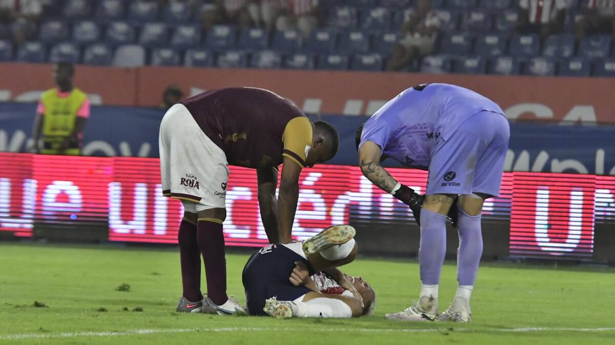 El atlanticense sufrió la lesión en el momento en que fue a disputar un balón en el área rival, quedó tendido y se demoró en levantarse. Salió para ser atendido, regresó y nuevamente sintió la molestia. Los médicos lo atendieron y volvió al partido, pero como ya no había más cambios tuvo que seguir en campo con esa molestia.