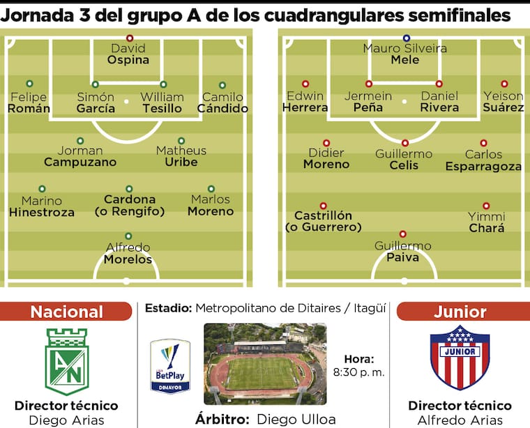 Probables formaciones titulares del partido entre Nacional y Junior, en la tercera fecha de los cuadrangulares semifinales.