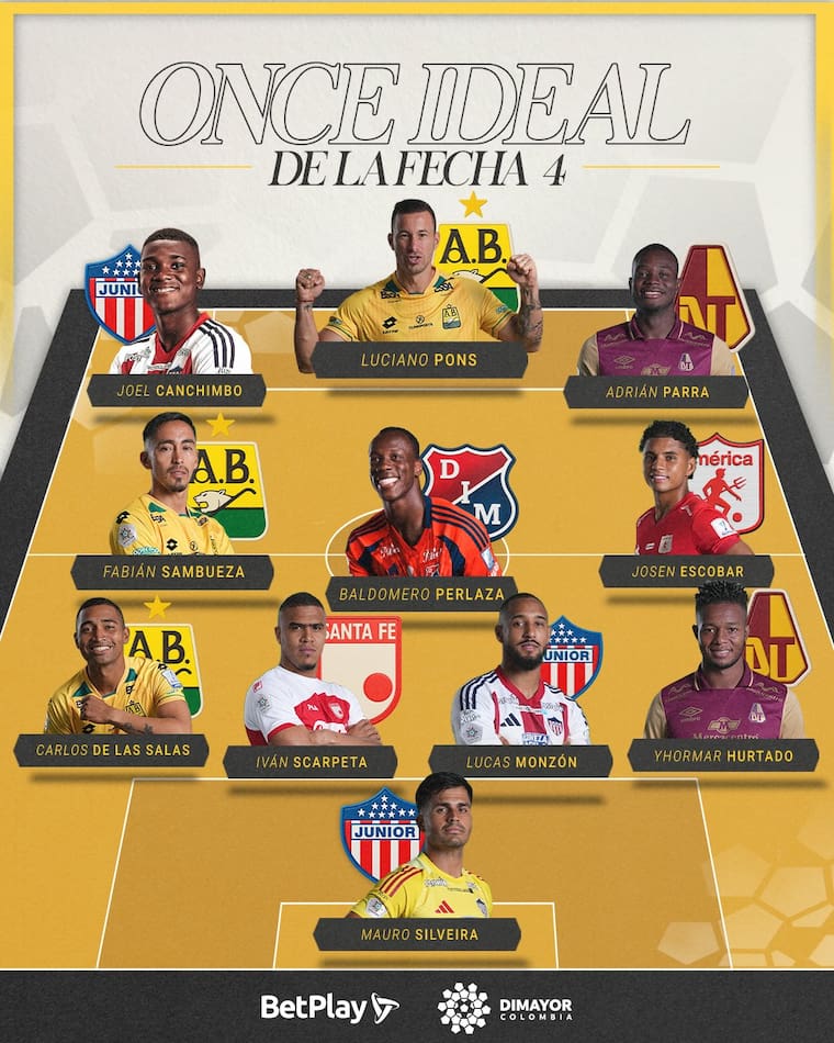 La Dimayor dio a conocer este martes una alineación de jugadores destacados de la jornada y los dos uruguayos del cuadro rojiblanco y el canterano se ganaron un lugar después de sus buenas actuaciones en el triunfo 2-1 sobre Atlético Nacional.
