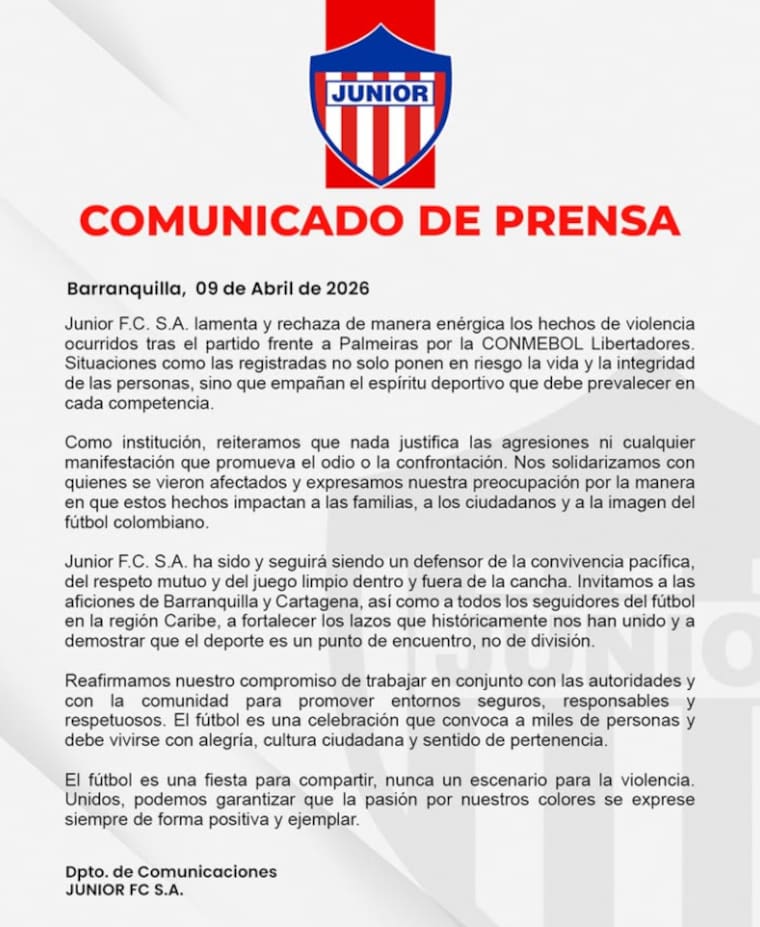 “Junior F.C. S.A. lamenta y rechaza de manera enérgica los hechos de violencia ocurridos tras el partido frente a Palmeiras por la Conmebol Libertadores. Situaciones como las registradas no solo ponen en riesgo la vida y la integridad de las personas, sino que empañan el espíritu deportivo que debe prevalecer en cada competencia”, señaló la institución en el documento.