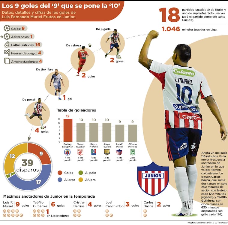 Aunque todavía se encuentra lejos de su mejor versión física y futbolística, Luis Fernando Muriel Fruto ya contabiliza nueve goles con la camiseta de Junior. Dos tantos de pelota en movimiento, dos de cabeza, uno de tiro libre y cuatro de penalti (que no valen menos que los anteriores) es el aporte del tomasino en su primera campaña con el equipo de sus amores.