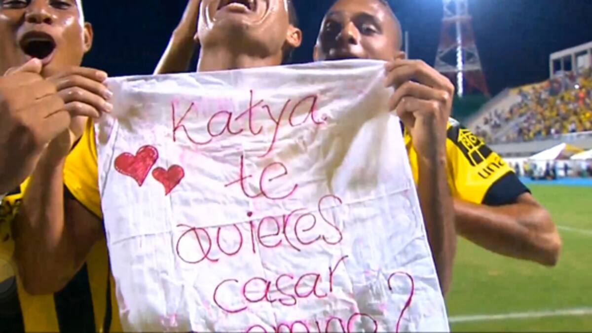 El delantero cesarense, en la celebración tras anotar el gol con el que su equipo venció 1-0 al Chicó FC, el domingo anterior en el estadio de Barrancabermeja, sacó un pañuelo adornado con dos corazones y con el siguiente interrogante: 'Katya, ¿te quieres casar conmigo?'.