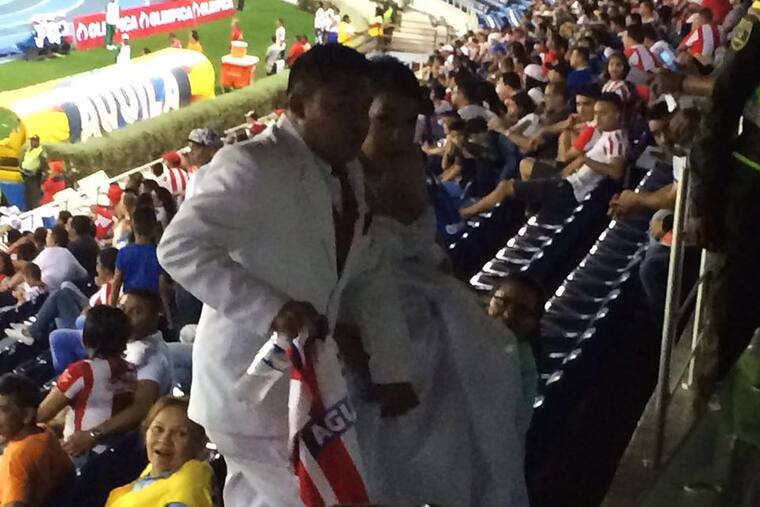 Kevin, con saco y corbata, Julieth, con su vestido largo blanco, estaban como si nada en medio de la gradería baja de oriental, mientras en la cancha jugaba el equipo amado, con el que se casaron desde la cuna, el que acompañan en la salud y en la enfermedad, al que hace rato juraron fidelidad y amor eterno. Antes que los dos se subieran al altar, el corazón de ambos tenía dueño.