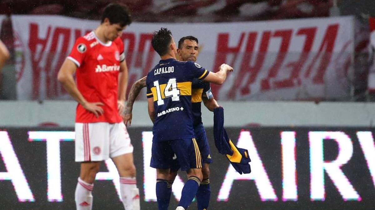 Bajo una intensa lluvia, Boca Juniors consiguió este miércoles un valioso triunfo por 0-1 ante Internacional gracias al tanto de Carlos Tevez, que dedicó al fallecido Diego Armando Maradona y acerca al equipo argentino a los cuartos de final de la Copa Libertadores.