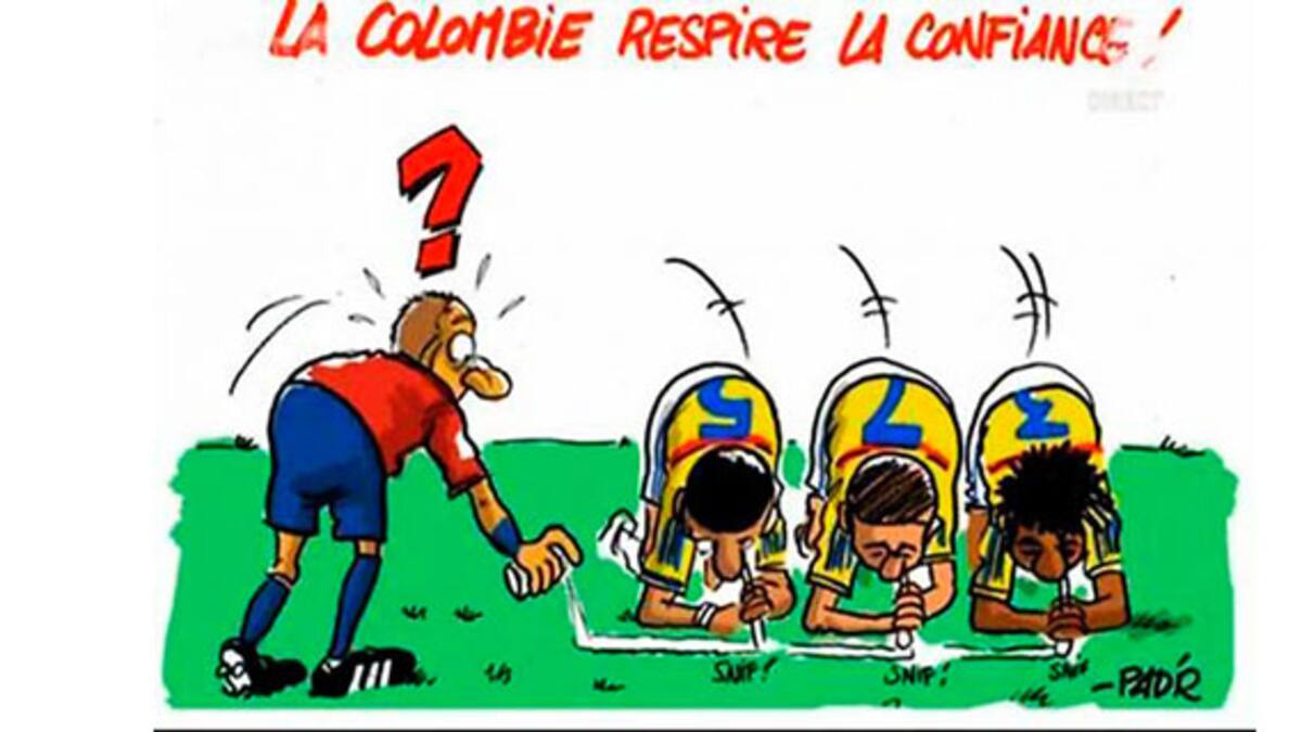 La viñeta, publicada en la Radio Televisión Belga Francófona (RTBF), lleva por título 'Colombia respira confianza' y muestra a tres jugadores aspirando las rayas blancas reglamentarias introducidas por la FIFA para delimitar las líneas de falta.