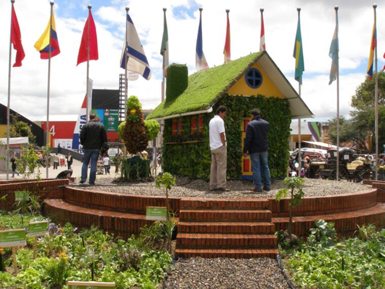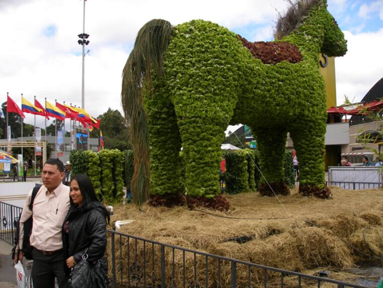 La mitad de la plaza de banderas de Corferias está ocupada por un caballo gigante, de unos 6 metros de alto; imponente, como debió verse el que llegó a Troya en la historia mitológica. Pero en vez de estar lleno de guerreros griegos, la peculiaridad de este es que está formado por lechugas y repollos de hojas moradas. Y como cola tiene ramas de palmeras.
