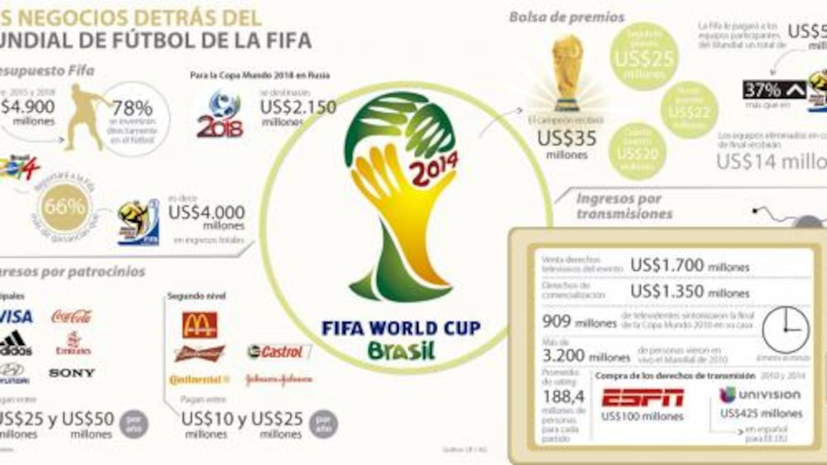 La Fifa tiene un millonario negocio detrás de las Copas del Mundo. Según la revista Forbes, el torneo de Brasil 2014 le generará al organismo regulador del fútbol 66% más de ganancias de lo que obtuvo en Sudáfrica 2010, es decir US$4.000 millones en ingresos totales, que en su mayoría provienen de la venta de los derecho televisivos.