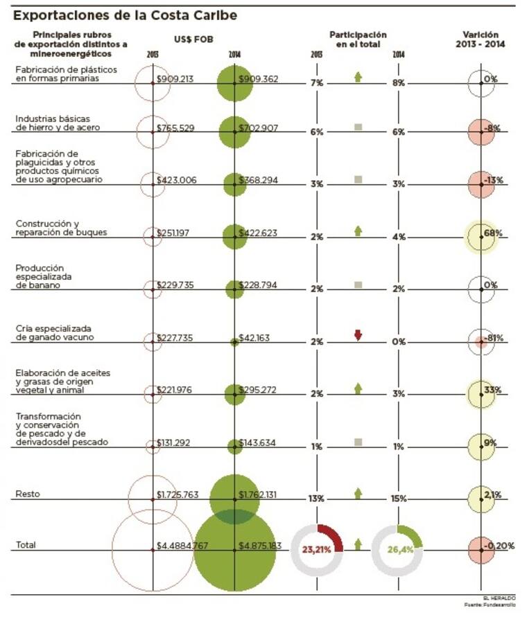 El descenso en las exportaciones entre 2013 y 2014 se debió en gran medida a una caída del 77% en las exportaciones de productos de la refinación del petróleo. De hecho en 2013, este rubro representó el 13,6% de las exportaciones totales de la región y en 2014 representó 3,6% (USD1.853.660,68 miles FOB -Free on board- y USD424.819 miles FOB, respectivamente). Influyó en menor medida una caída del 66% en las exportaciones por extracción de gas natural. La diferencia entre lo exportado por estos dos rubros entre 2013 y 2014 es de cerca de USD2 mil millones. En el caso del carbón, un producto cuyas exportaciones tradicionalmente crecen a tasas altas, entre 2013 y 2014 éstas aumentaron solo 3%. El resto de exportaciones, como muestra la infografía, presentaron pequeñas variaciones.