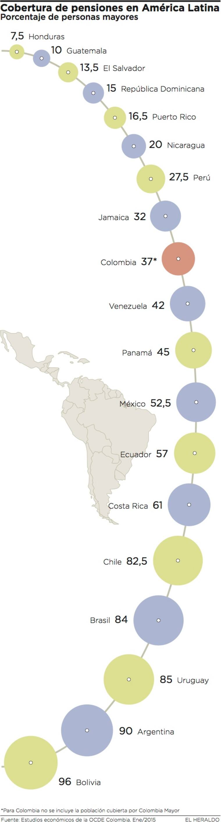 Para la OCDE esto constituye un avance positivo. 'En Colombia se han empezado a crear programas aun marginales', dice Parada y sugiere que el país debe llegar a un punto en que el estado pueda aportar una 'pensión mínima vital' a los adultos mayores que no han podido acceder al sistema.