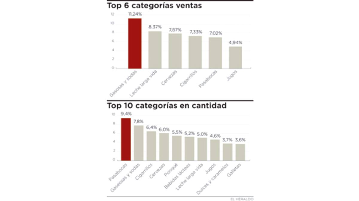 Mayor demanda. Un estudio realizado por Servitienda reveló que los cinco productos que tuvieron mayor demanda entre enero y abril de este año fueron: gaseosas y sodas con una participación del 11,24%, leche larga vida (8,37%), cervezas (7.87%), cigarrillos (7,33%), pasabocas (7,02%) y jugos (4,94%).