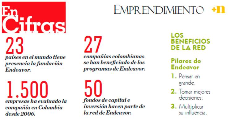 En Colombia, la ONG llegó en 2006 y Adriana Suárez, gerente nacional, contó a +NEGOCIOS (+n) que, después de nueve años, inversionistas como Alejandro Santodomingo, Andrés Echeverría, del grupo Corona; Eduardo Pacheco de Colpatria, Rubén Minski, de Procaps, y Guillermo Heins, presidente de Dupond, están comprometidos con la actividad de Endeavor.