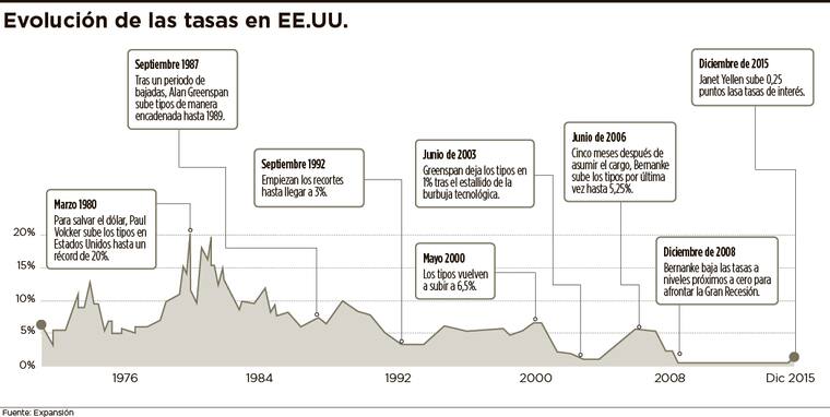 Con este repunte, la institución que preside Janet Yellen pone fin a siete años justos sin movimientos, ya que las tasas llevaban congeladas en mínimos de entre el 0,25% y el 0% desde diciembre de 2008.