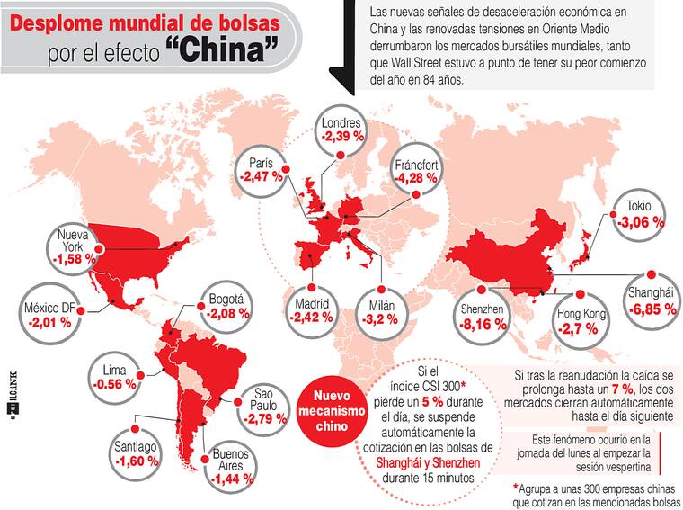 El desplome de los mercados bursátiles en China provocó este lunes el peor inicio de año en Wall Street desde 2008, con el Dow Jones, su principal indicador, cayendo al cierre 1,58 % y el índice Nasdaq por debajo de los 5.000 puntos.