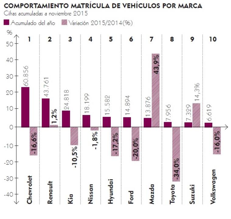 MATRÍCULAS. En el top de matrículas de vehículos nuevos en Colombia, Chevrolet se ubicó el año anterior en primer lugar con 60.856 automotores matriculados, lo que representó un 24% de la totalidad del mercado. La cifra fue reportada por el Comité Automotor Colombiano del cual hacen parte la Asociación Nacional de Empresarios (Andi), Fenalco y la firma Econometría.