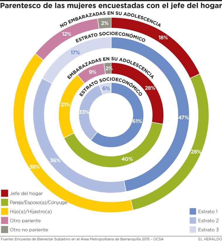 Las cifras. Los datos tomados de la encuesta dejan entrever que el 49% de las mujeres entre 19 y 45 años residentes en el Área Metropolitana de Barranquilla, viven en hogares de estrato 1. Sin embargo, mientras el 61% de las mujeres que fueron madres adolescentes pertenece al estrato más bajo, solo un 47% de las mujeres que no fueron madres adolescentes pertenece a este estrato. Asimismo, se observa una mayor proporción de mujeres que no fueron madres a temprana edad dentro de los estratos 2 y 3 (53% en total), comparado con las mujeres que tuvieron hijos antes de los 19 años (39% en total).
