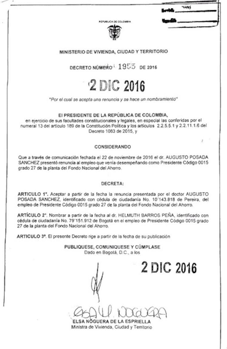 El abogado de la Universidad Externado, Helmuth Barros Peña, fue designado como el nuevo presidente del Fondo Nacional del Ahorro (FNA) mediante el Decreto 1955 de 2016. Peña reemplaza a Augusto Posada, quien había anunciado su salida desde el pasado noviembre.