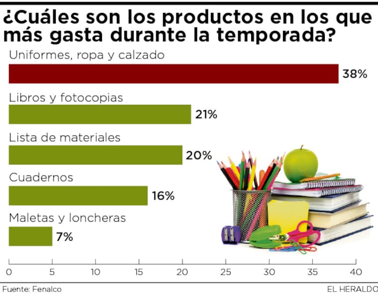 El sondeo virtual fue realizado con 544 personas cabeza de hogar en las principales ciudades del país y el 38% de consultados aseguró que los productos en los que más gastan son uniformes, ropa y calzado; 21% en libros y fotocopias; 20% en la lista de materiales; 16% en cuadernos y 5% en maletas y loncheras.