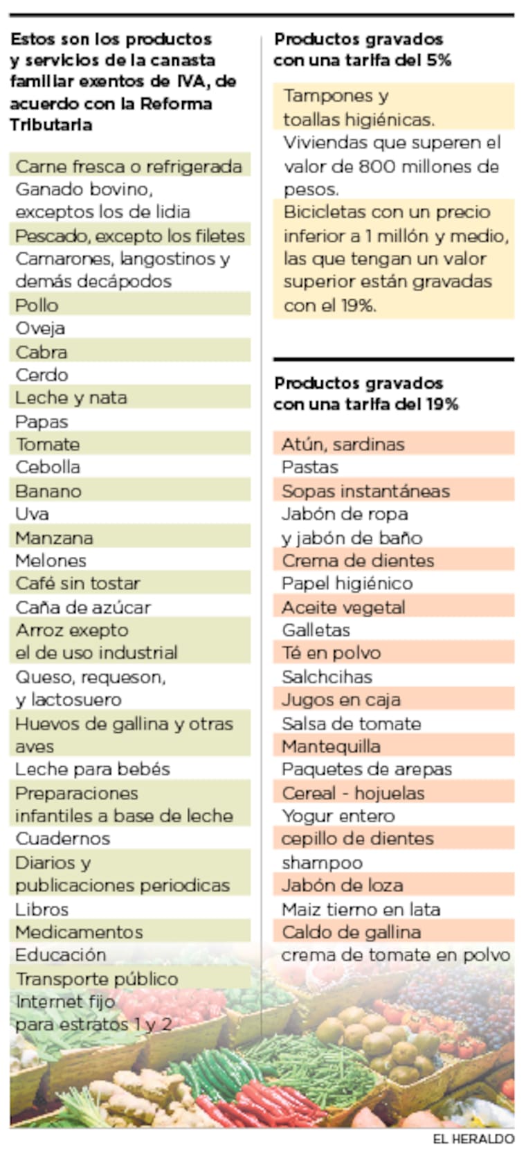 Ayer terminó el plazo de transición para el cobro del IVA ,que pasó del 16% al 19%, de acuerdo con la modificación de la reciente Reforma Tributaria. Por eso es importante que conozca cuáles son los productos de la canasta familiar exentos del impuesto, por cuáles se paga el 19%, y sepa sobre otros a los que tan solo se les carga el 5%.