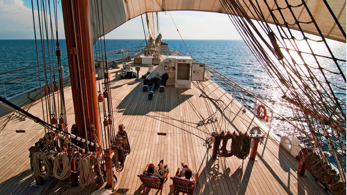 Cuenta tres mástiles, cuatro cubiertas y 47 cabinas dotadas de amplias comodidades.