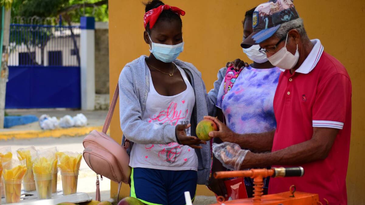 Con el objetivo de atender a su clientela, desde antes de las 7:00 a.m., Miguel Barrios, de 75 años, organiza su puesto de venta de mangos y otras frutas que ha estado instalado en una de las esquinas de la vía principal de Puerto Colombia desde hace más de 20 años.