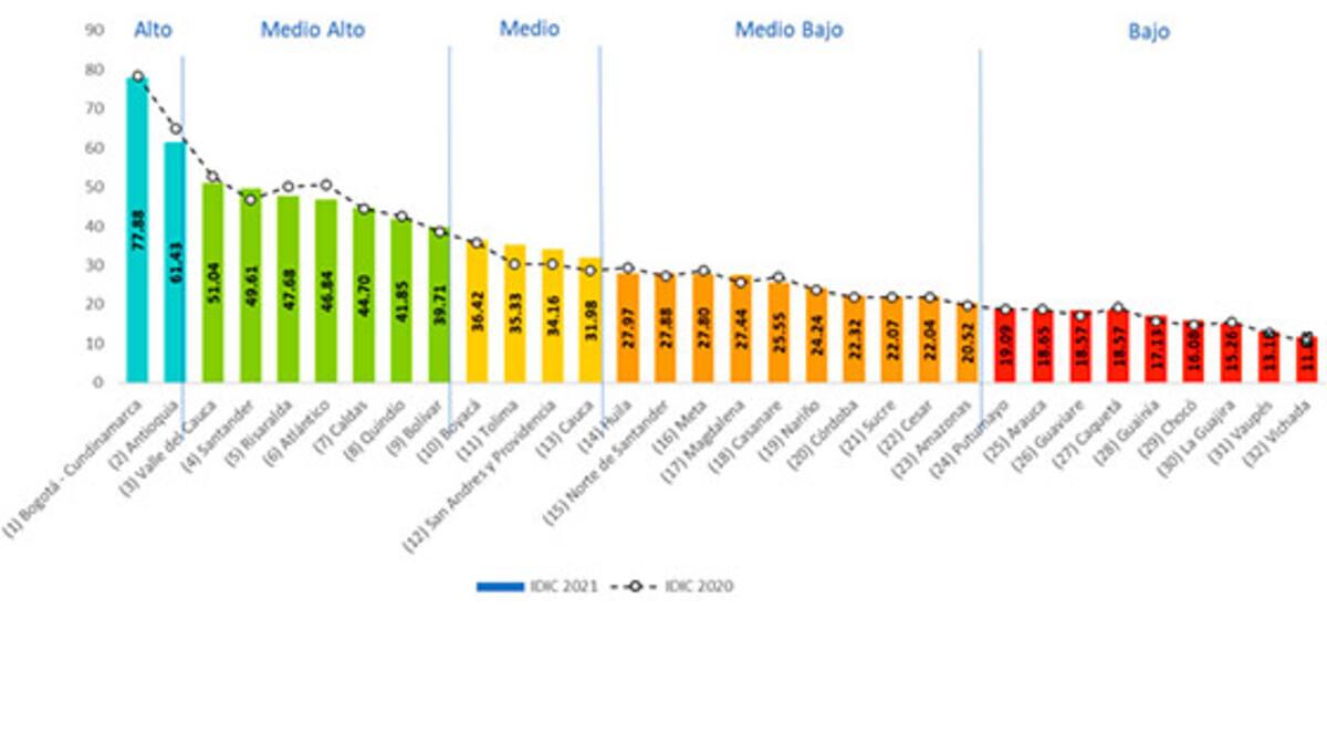 Según el IDIC, el primer lugar lo ocupa la región de Bogotá-Cundinamarca con 77,88 puntos, seguida por Antioquia con 61,43 puntos, ambas con un desempeño alto; y, el Valle del Cauca con 51,04, esta última con un ecosistema de desempeño medio-alto.