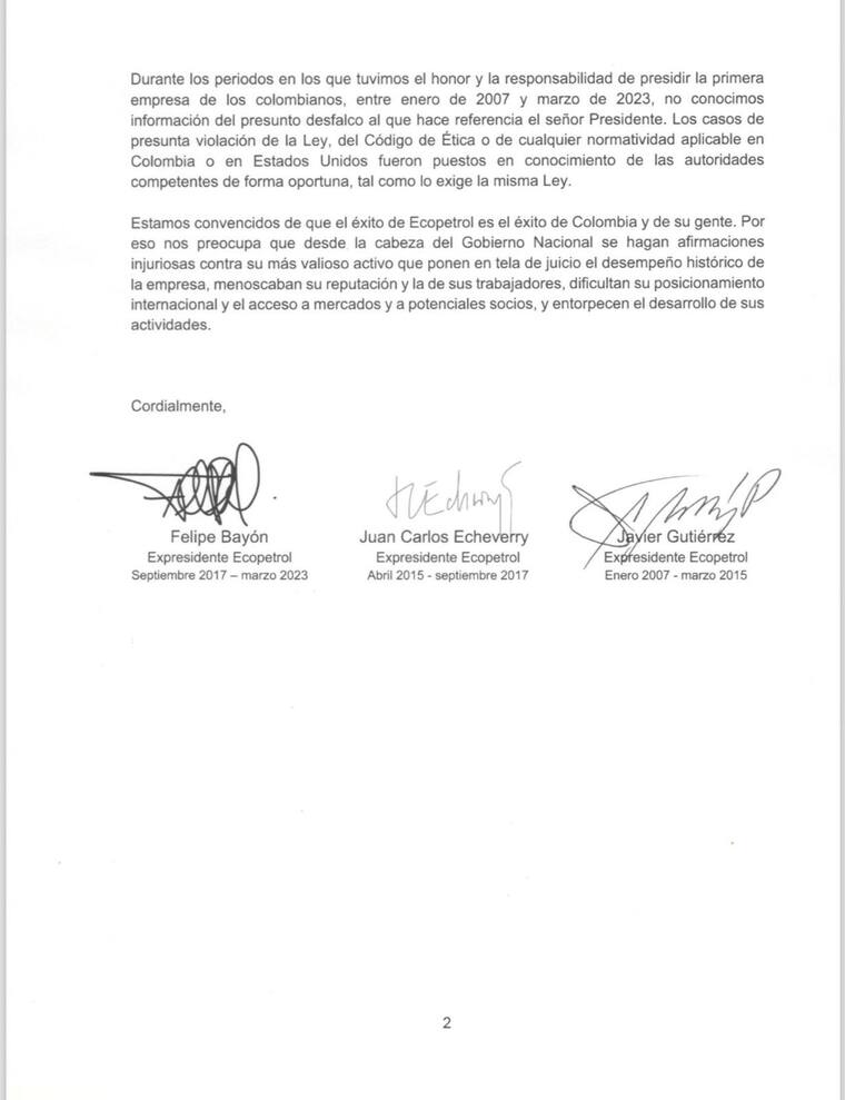 “Durante los periodos en los que tuvimos el honor y la responsabilidad de presidir la primera empresa de los colombianos, entre enero de 2007 y marzo de 2023, no conocimos información del presunto desfalco al que hace referencia el señor presidente. Los casos de presunta violación de la Ley, del Código de Ética o de cualquier normatividad aplicable en Colombia o en Estados Unidos fueron puestos en conocimiento de las autoridades competentes de forma oportuna, tal como lo exige la misma Ley”, se lee en la misiva.