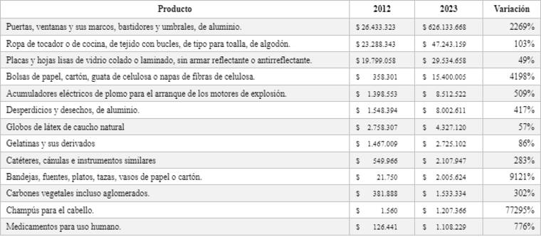 Entre los productos del Atlántico que tienen los principales crecimientos hacia Estados Unidos en el período TLC están las puertas, ventanas y sus marcos, bastidores y umbrales de aluminio; seguido de ropa de tocador o de cocina; placas; bolsas de papel; gelatinas; medicamentos para uso humano; catéteres; globos de látex, entre otros.