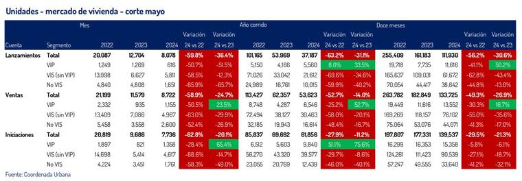 Para el periodo de enero y mayo del presente año, las ventas de vivienda registraron una contracción acumulada del -14 % frente al mismo periodo del 2023, así lo reveló el más reciente informe de Coordenada Urbana, el sistema de información de la Cámara Colombiana de la Construcción (Camacol).