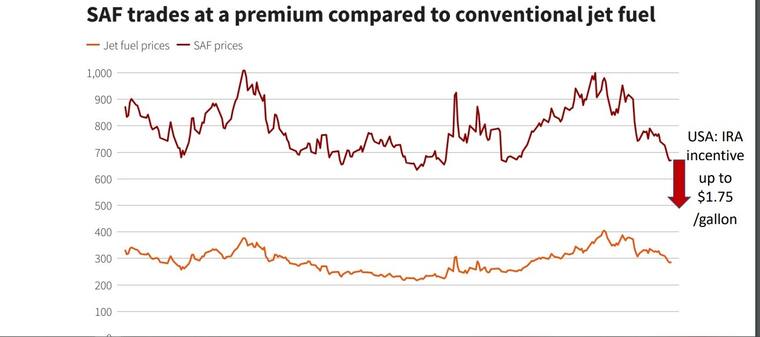 Por ejemplo, en este gráfico se puede ver la diferencia entre los precios del SAF y los de jet fuel (combustible de aviación).