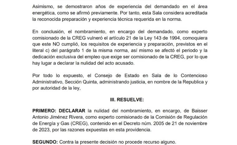 En particular, el fallo determinó que Jiménez no reunía los seis años de experiencia técnica y de responsabilidad en el sector energético, un requisito indispensable para el cargo, según el parágrafo 1 del artículo 21 de dicha ley. Este aspecto fue uno de los pilares del argumento de los demandantes.