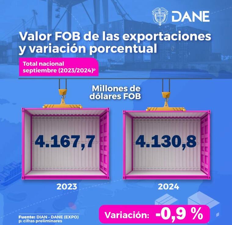 Según el Dane y la Dian, las exportaciones fueron de USD 4.130,8 millones en septiembre de 2024, mientras que en el mismo periodo del año pasado fueron de USD4.167,7 millones.
