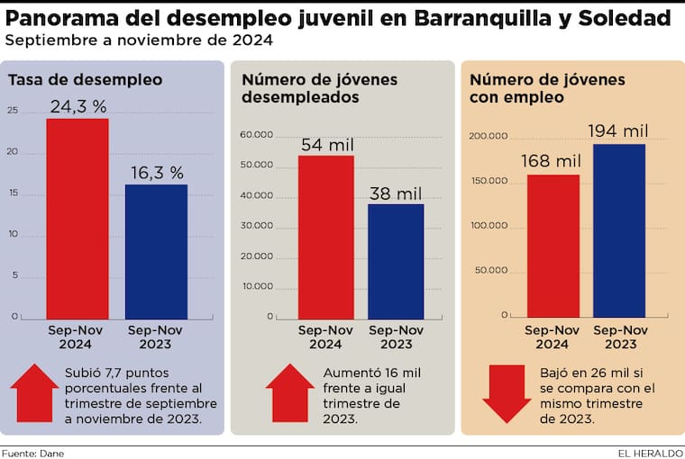 El panorama del desempleo juvenil en Barranquilla y Soledad es crítico incluso si lo comparamos con la tasa nacional, ya que en igual trimestre, la tasa de desocupación en Colombia fue del 15,7 %. Esto representó una reducción leve de 0,3 puntos porcentuales si se compara con el periodo de septiembre a noviembre de 2023, cuando estuvo en 16 %.