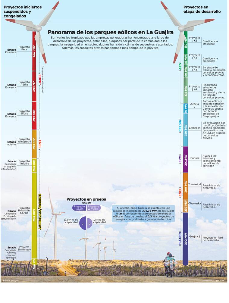 A pesar de estas cualidades, factores sociales, regulatorios, de seguridad en el territorio y ambientales entre otros, han impedido el desarrollo de dichos proyectos y la entrada, según XM –operador del mercado energético en Colombia– de 3.877 megavatios en la subárea operativa de La Guajira, Cesar y Magdalena (GCM).