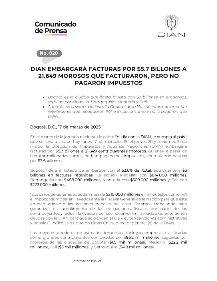 “Los casos de quiénes adeudan más de $210.000 millones en impuestos como IVA e Impoconsumo serán llevados ante la Fiscalía General de la Nación para que esta entidad adelante las acciones penales del caso. Estamos trabajando para garantizar el cumplimiento de las obligaciones fiscales por parte de los contribuyentes y reducir la evasión, por eso hacemos un llamado a quiénes tienen deudas con la DIAN para que se pongan al día y eviten sanciones administrativas y penales”, dijo.