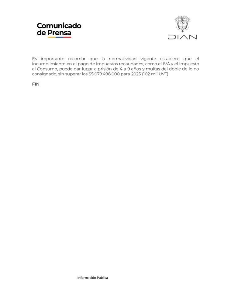 En el comunicado emitido por la entidad también establece que la normatividad vigente establece que el incumplimiento en el pago de impuestos recaudados, como el IVA y el Impuesto al Consumo, puede acarrear penas de prisión de 4 a 9 años y multas del doble de lo no consignado, sin superar los $5.079.498.000 para 2025.