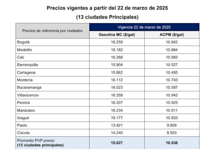 Este ajuste, que afecta a las 13 ciudades principales del país, presenta variaciones significativas según la ubicación geográfica. Villavicencio registra el precio más alto de gasolina ($16.359), mientras que Cúcuta mantiene los valores más bajos tanto en gasolina ($14.240) como en ACPM ($8.503).